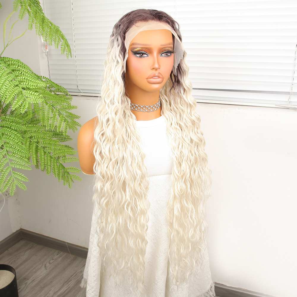 Uzun Su Dalgası Fiber Sentetik Peruk - Küllü Kumral / Beyaz Platin Ombre