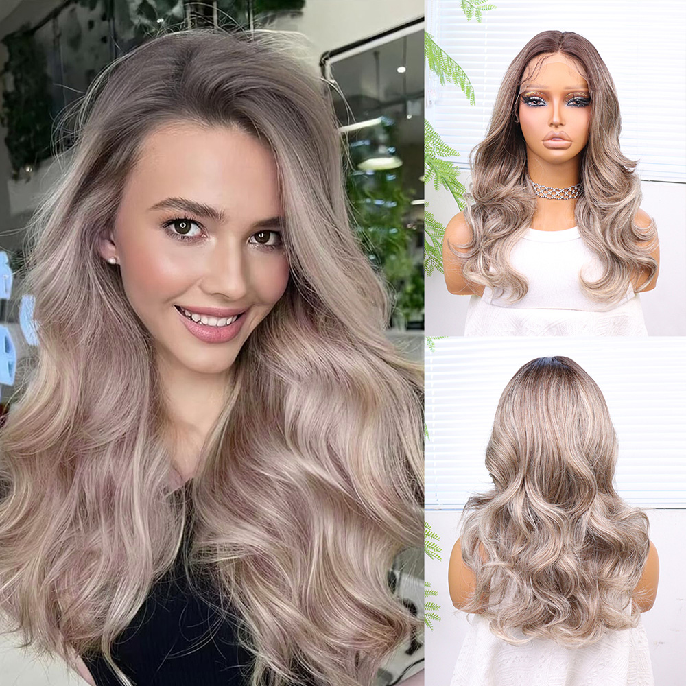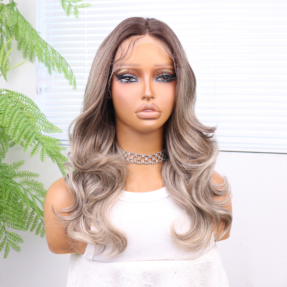 Kumral Platin Ombre ve Röfleli Fiber Sentetik Geniş Dalgalı Tül Peruk