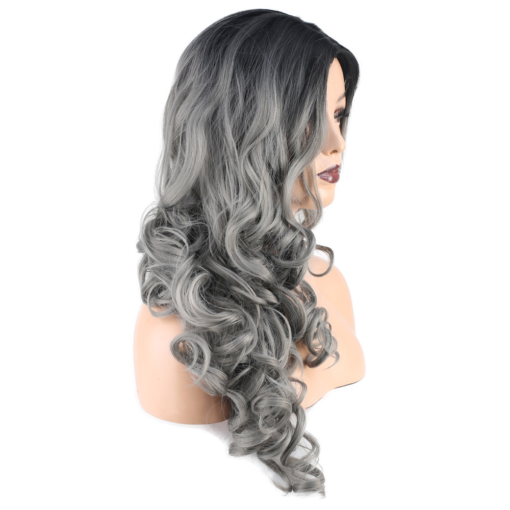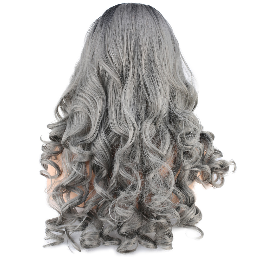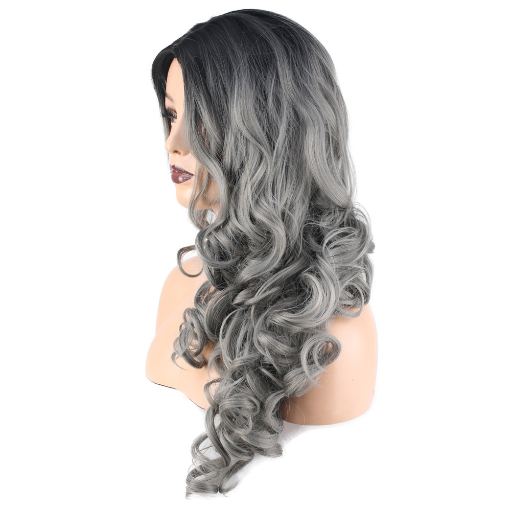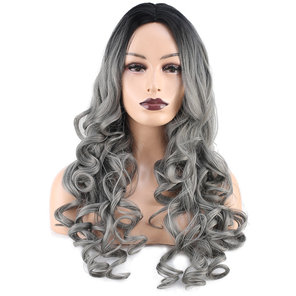 Dalgalı Perçemsiz Uzun Fiber Sentetik Peruk - Siyah / Gri Ombreli