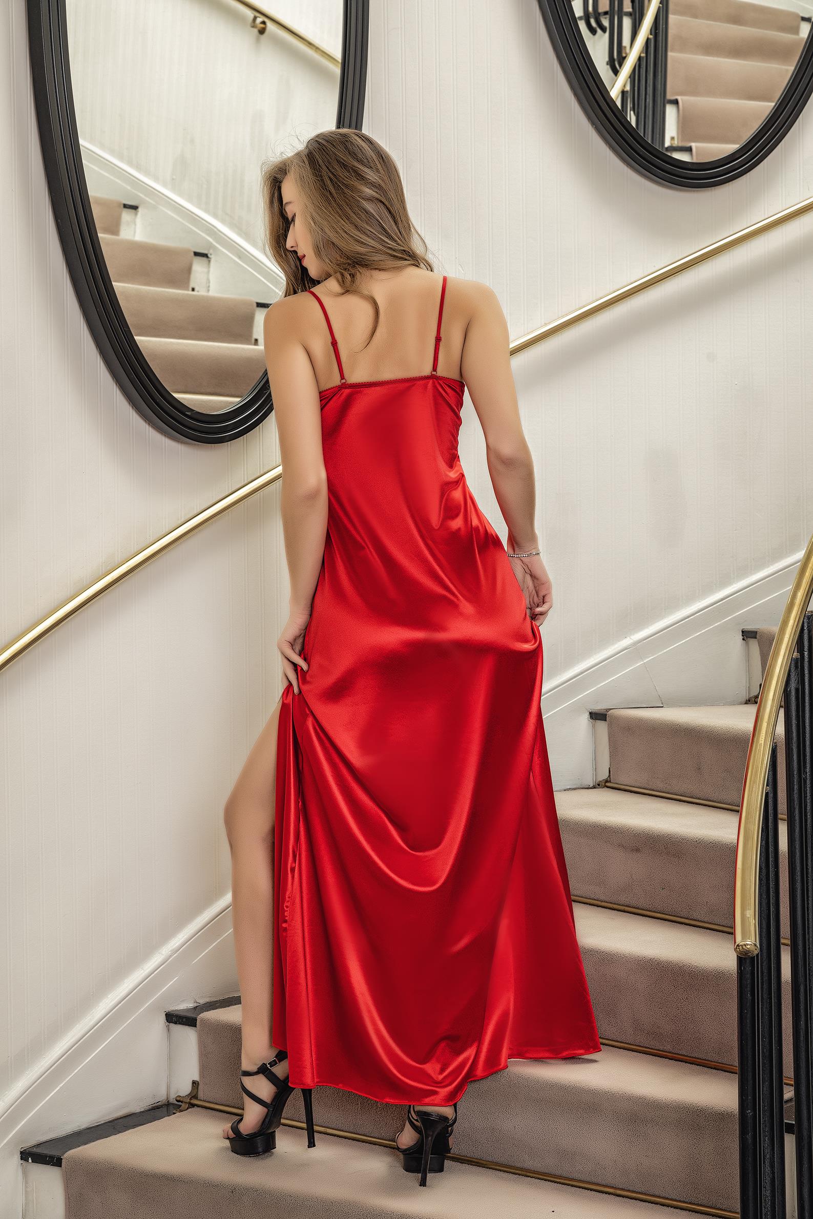 DANTELLİ UZUN YIRTMAÇLI SATEN GECELİK ELBİSE STRİNG TAKIM KIRMIZI (MGP31512)