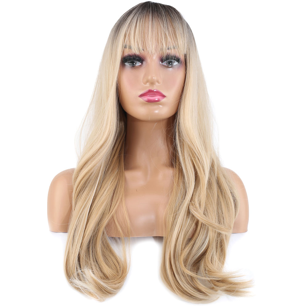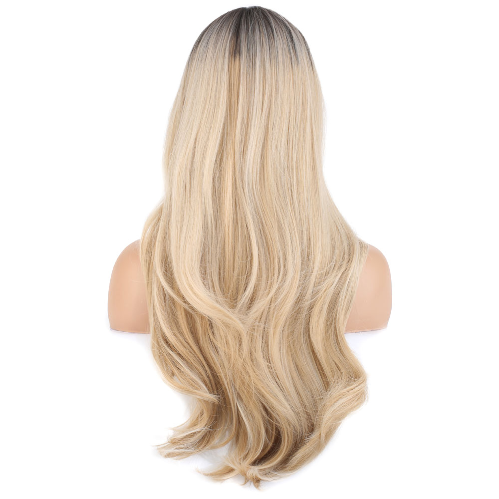 Doğal Dalgalı Perçemli Fiber Sentetik Uzun Boy Peruk - Kumral / Platin Ombre ve Röfleli