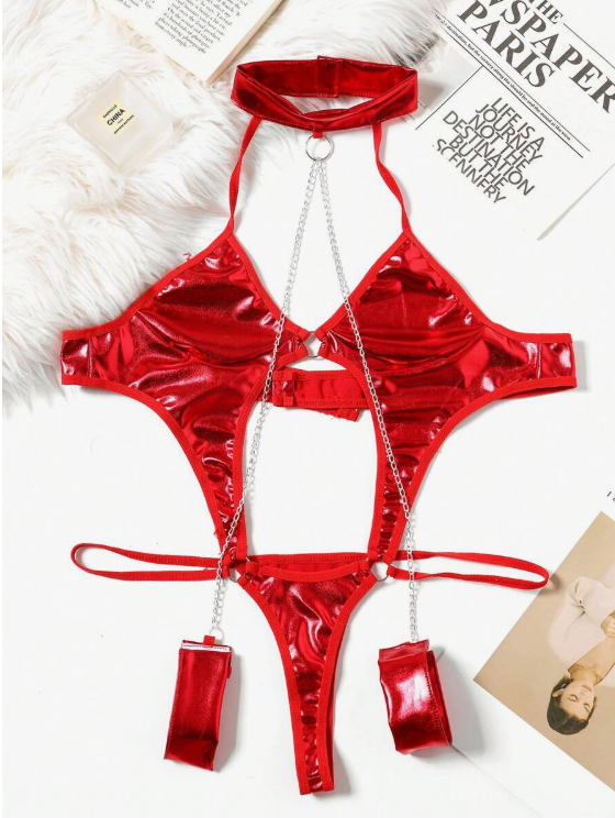 Fantezi Seksi Zincirli Tasmalı Kelepçeli Lame Gecelik, iddialı ve baştan çıkarıcı bir iç giyim parçasıdır. Bu gecelik, özgün tasarımıyla dikkat çeker ve özel anlarınızı daha heyecanlı hale getirmek için tasarlanmıştır.