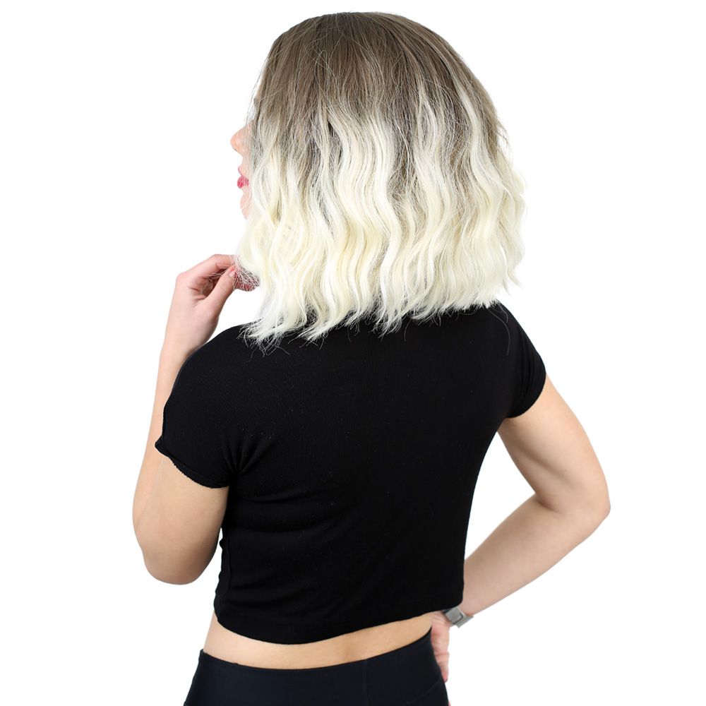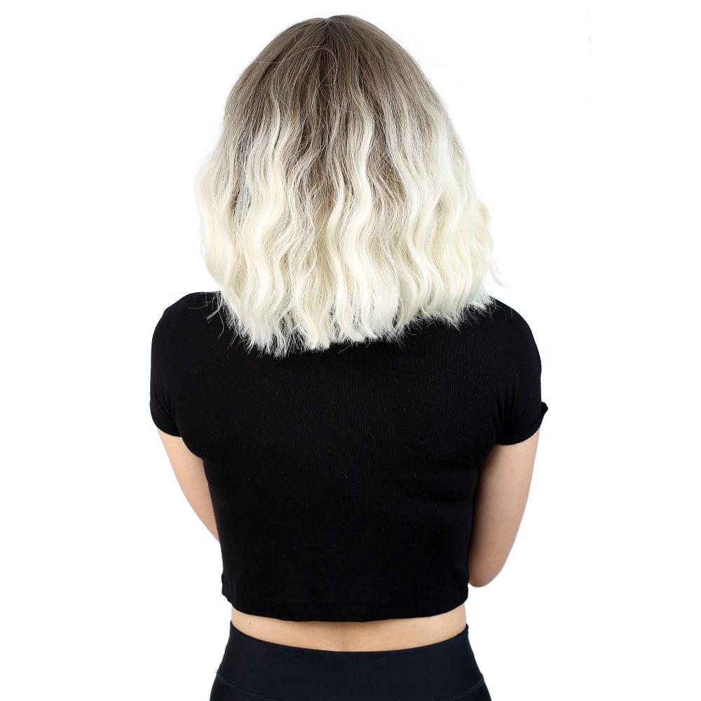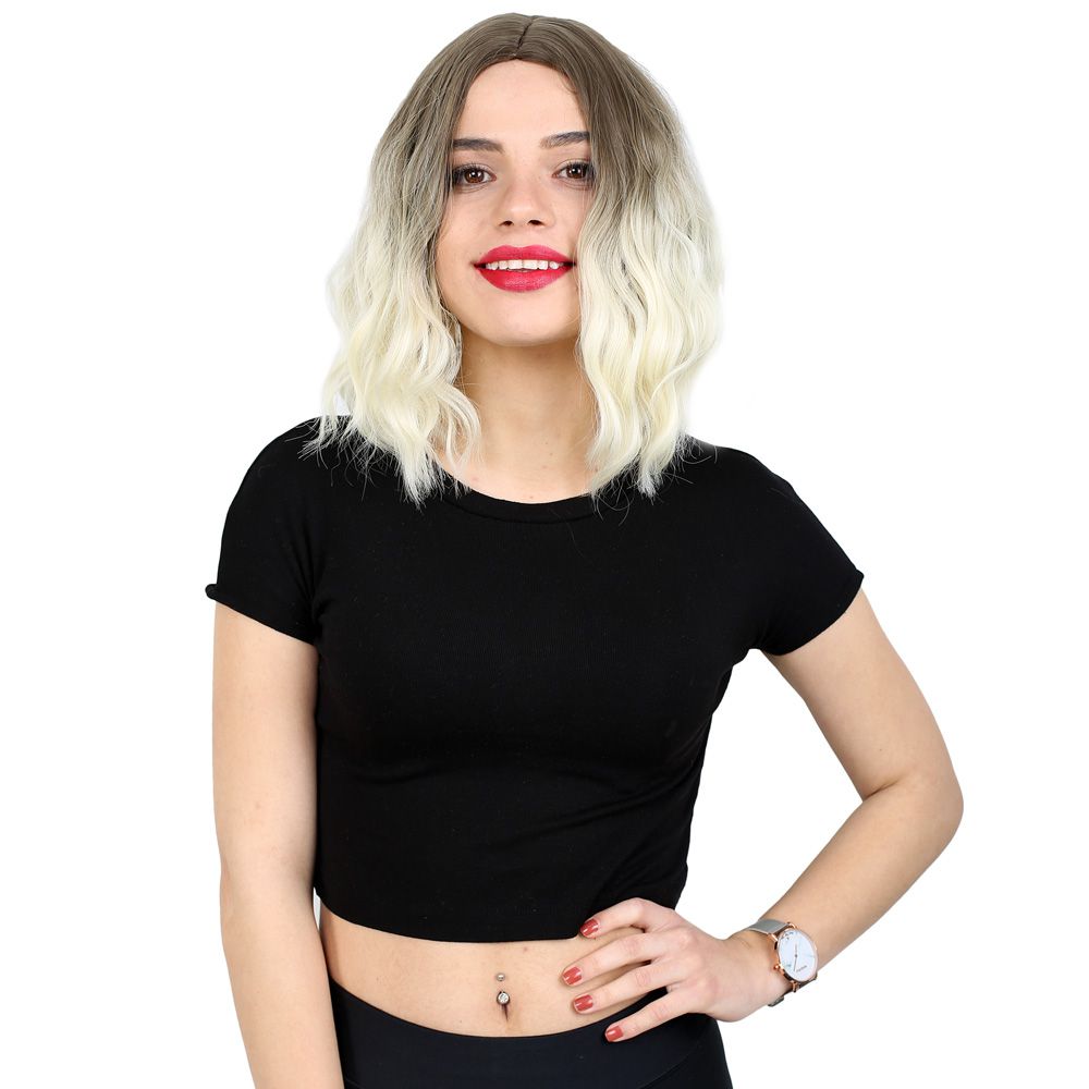 Fiber Sentetik Kısa Dalgalı Perçemsiz Peruk - Küllü Açık Kahve / Platin Ombreli