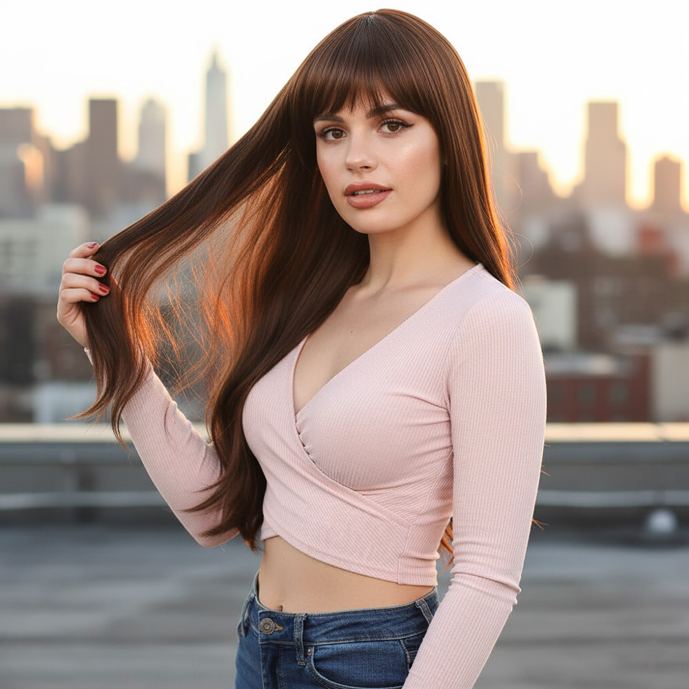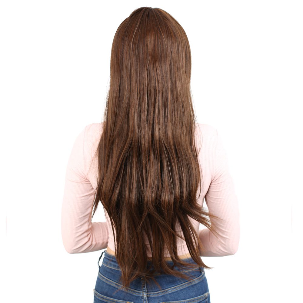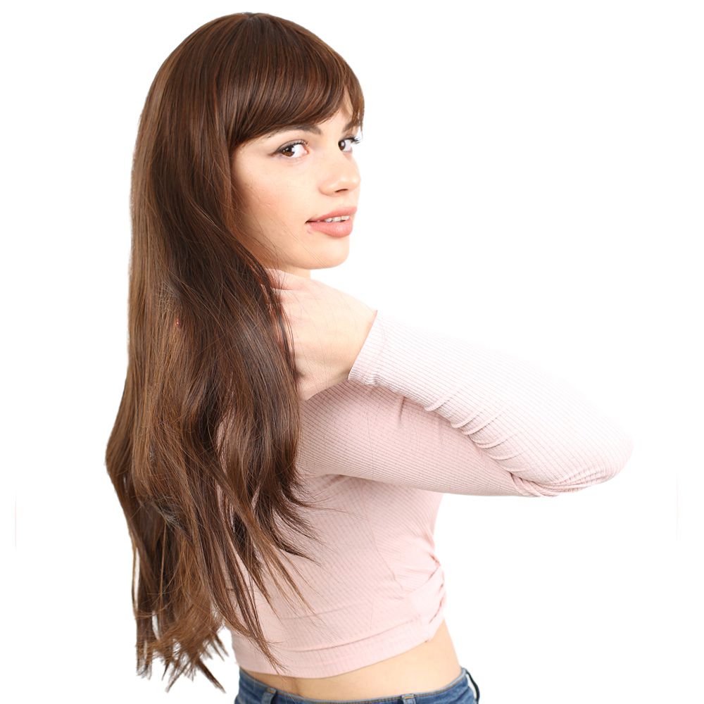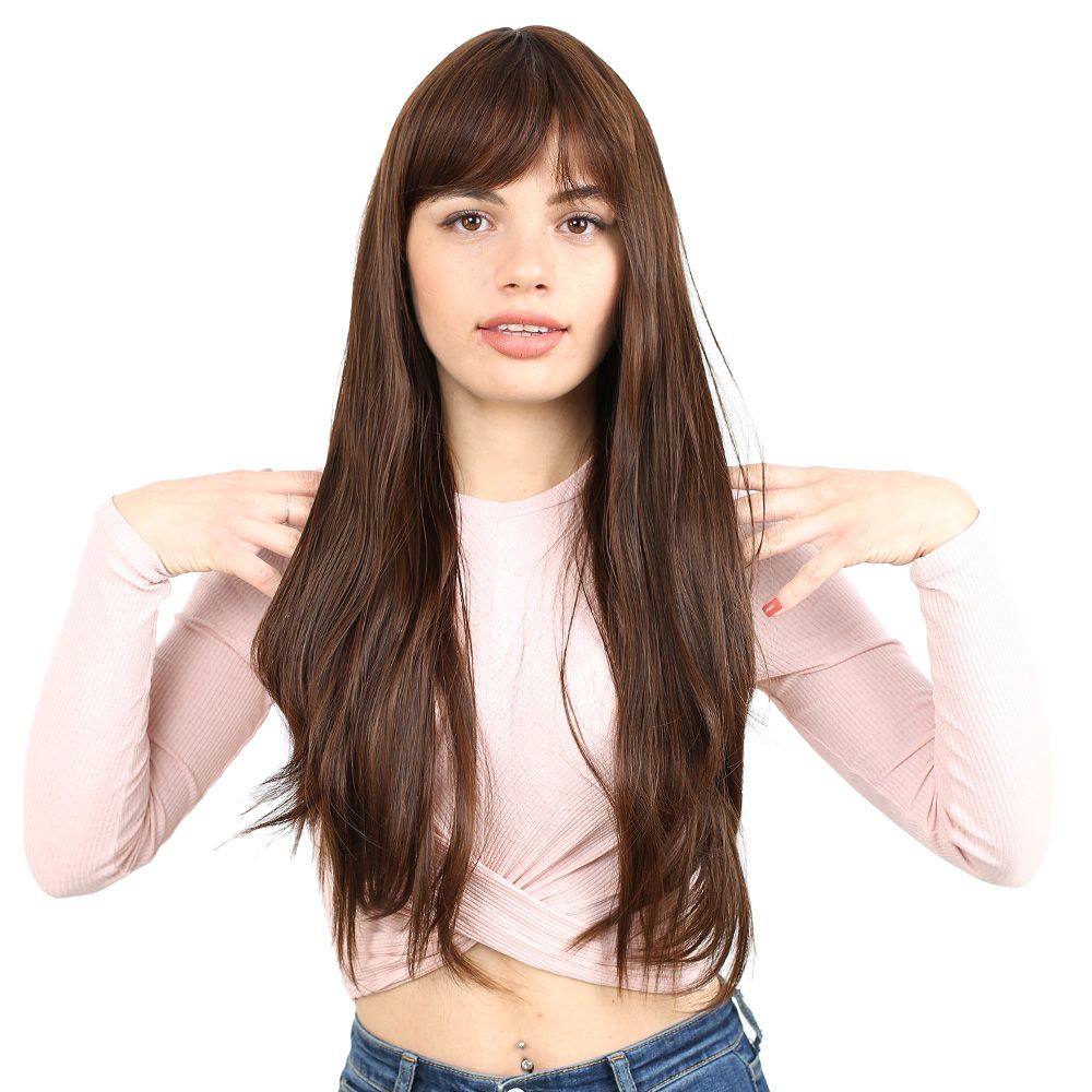 Fiber Sentetik Uzun Düz Kahküllü Peruk - Kahve Karamel