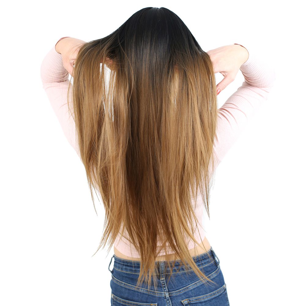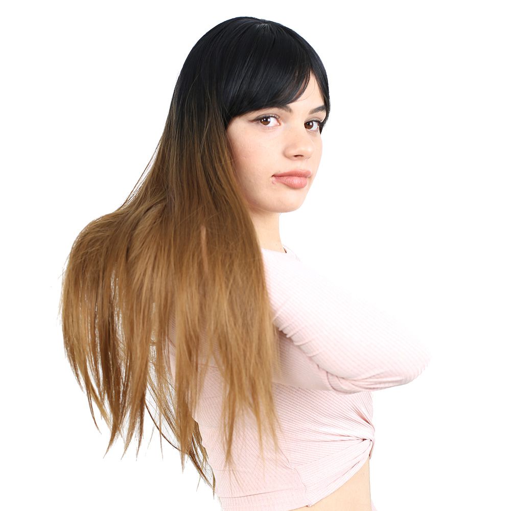 Fiber Sentetik Uzun Düz Kahküllü Peruk - Siyah / Karamel Ombreli