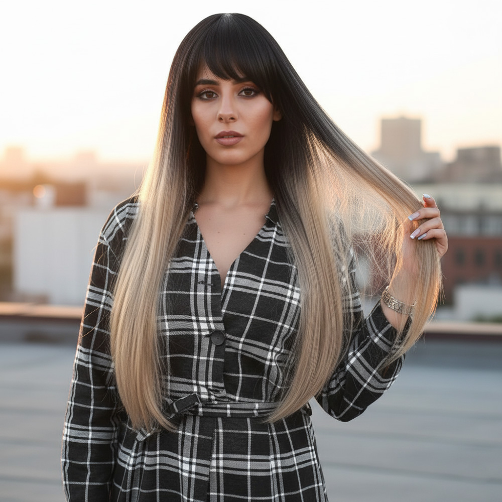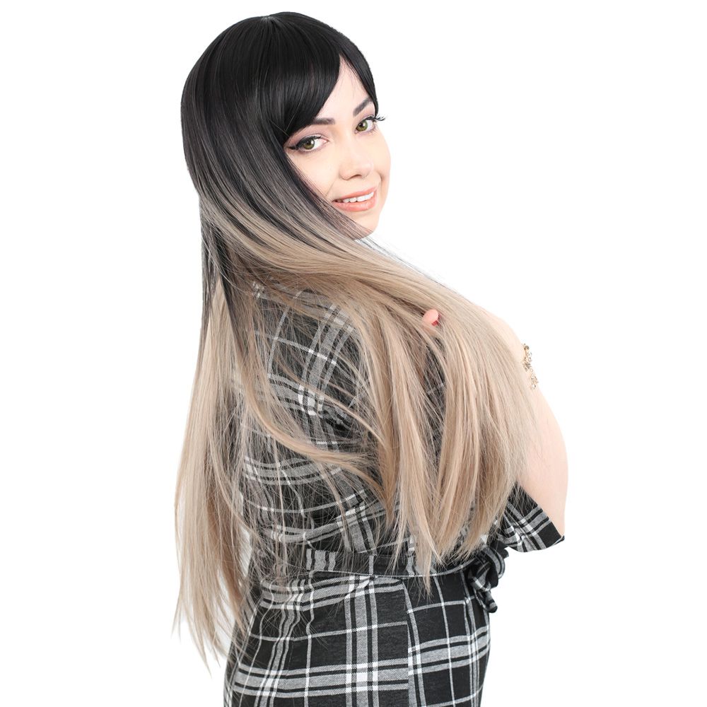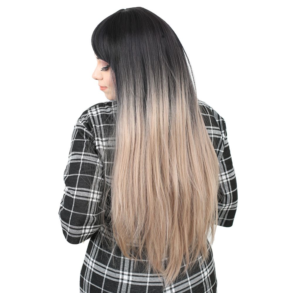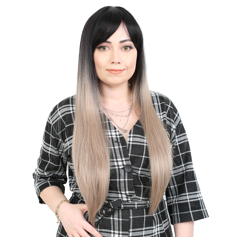 Fiber Sentetik Uzun Düz Kahküllü Peruk - Siyah / Küllü Bebek Sarı Ombreli
