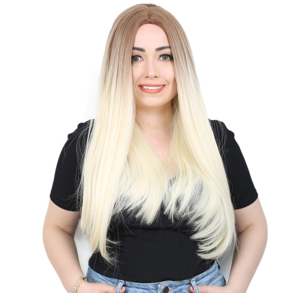 Fiber Sentetik Uzun Düz Peruk - Kumral / Platin Ombreli