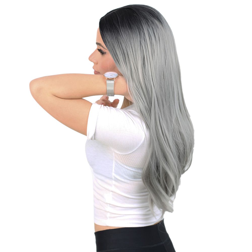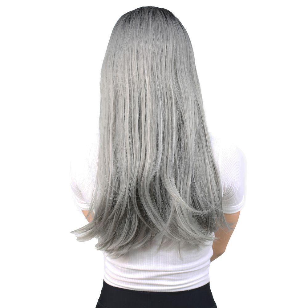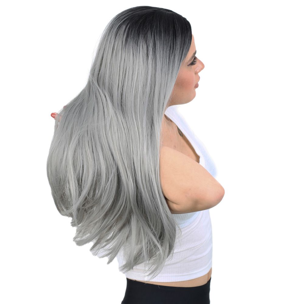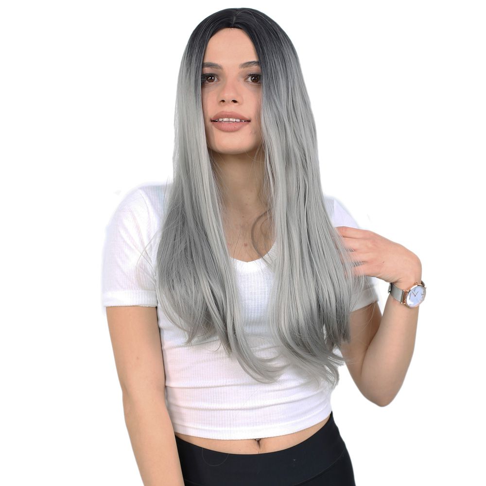 Fiber Sentetik Uzun Düz Peruk - Siyah / Gri Ombreli