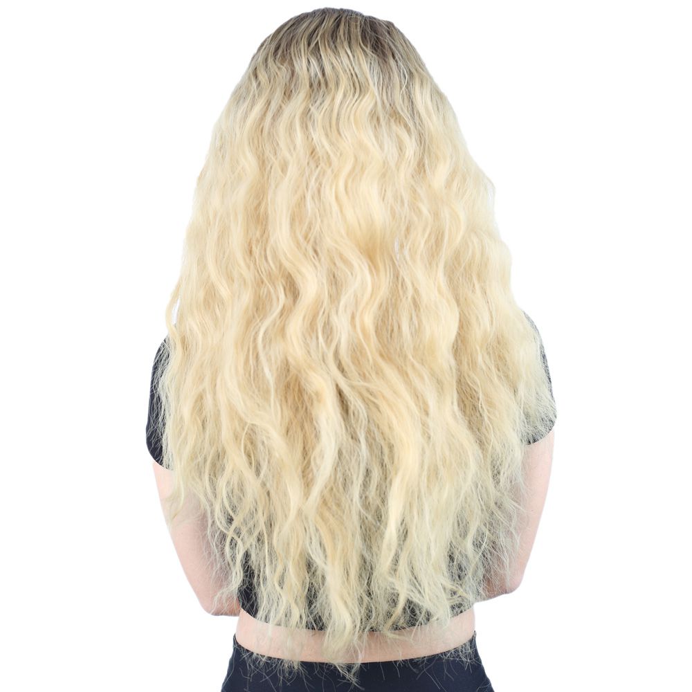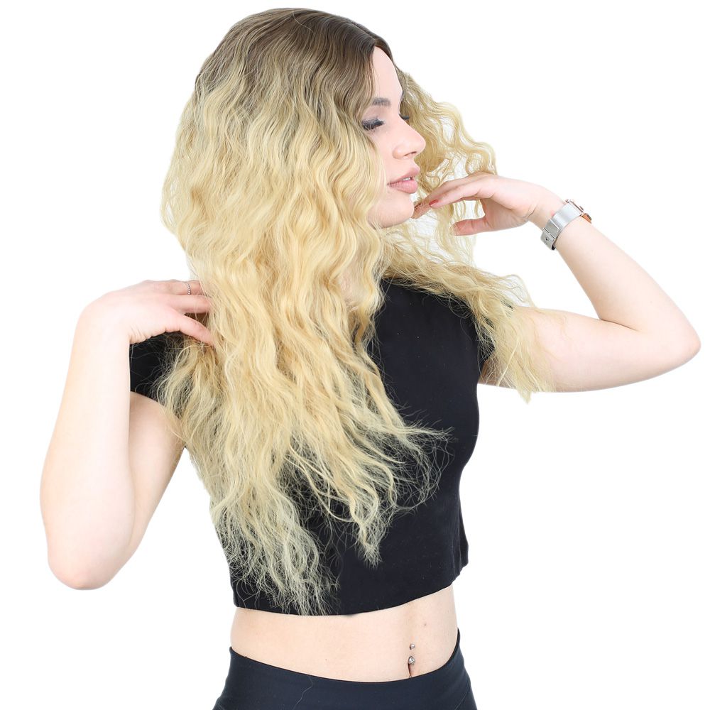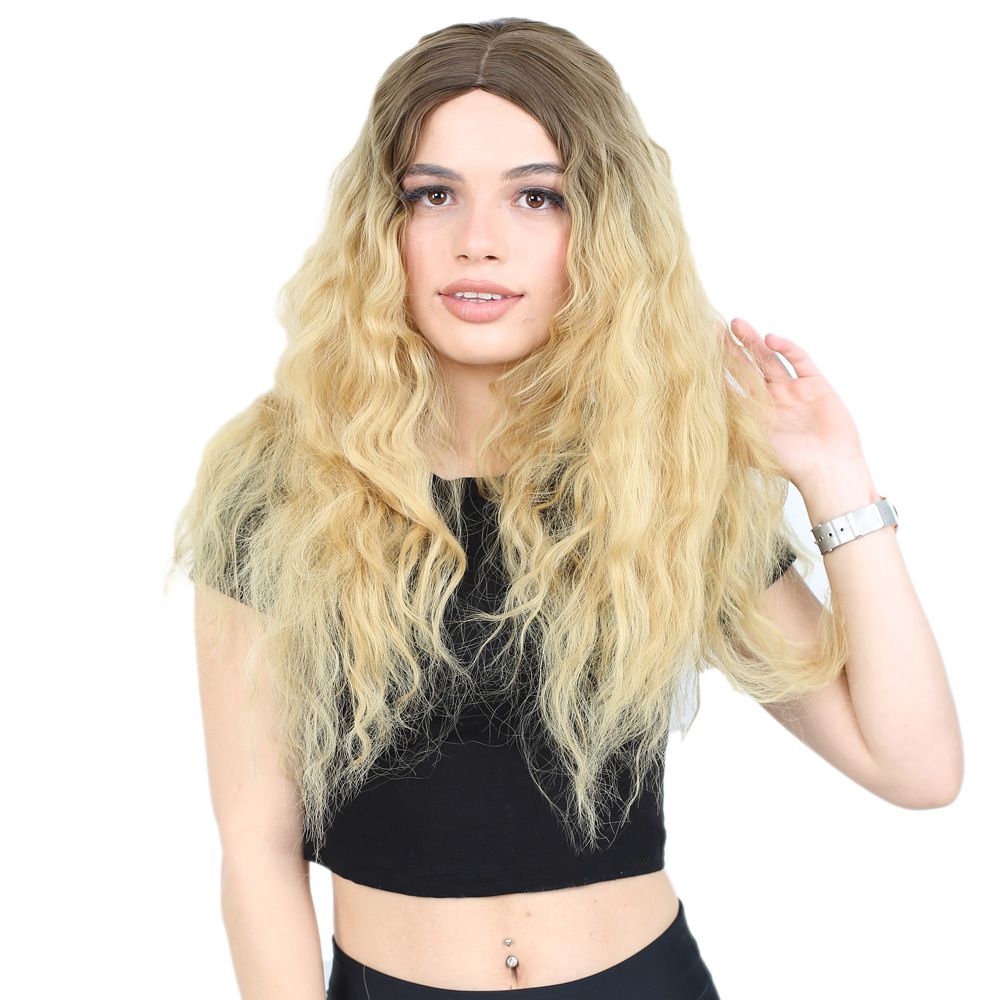 Kabarık Dalgalı Uzun Fiber Sentetik Peruk - Kumral / Sarı Ombreli
