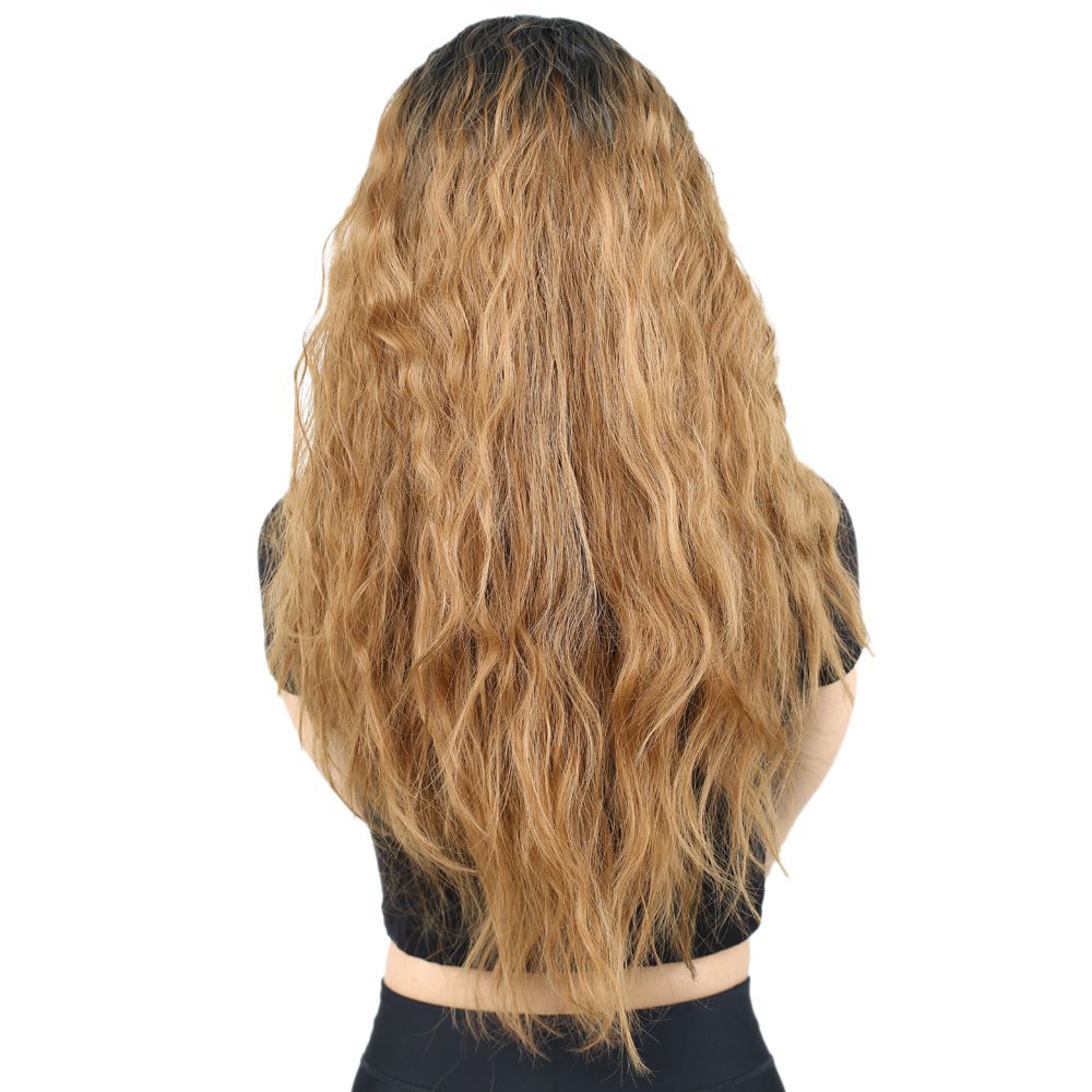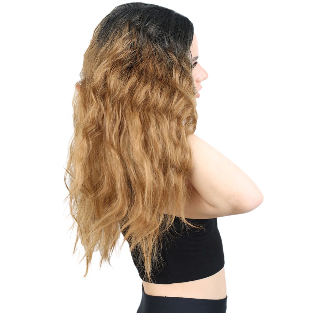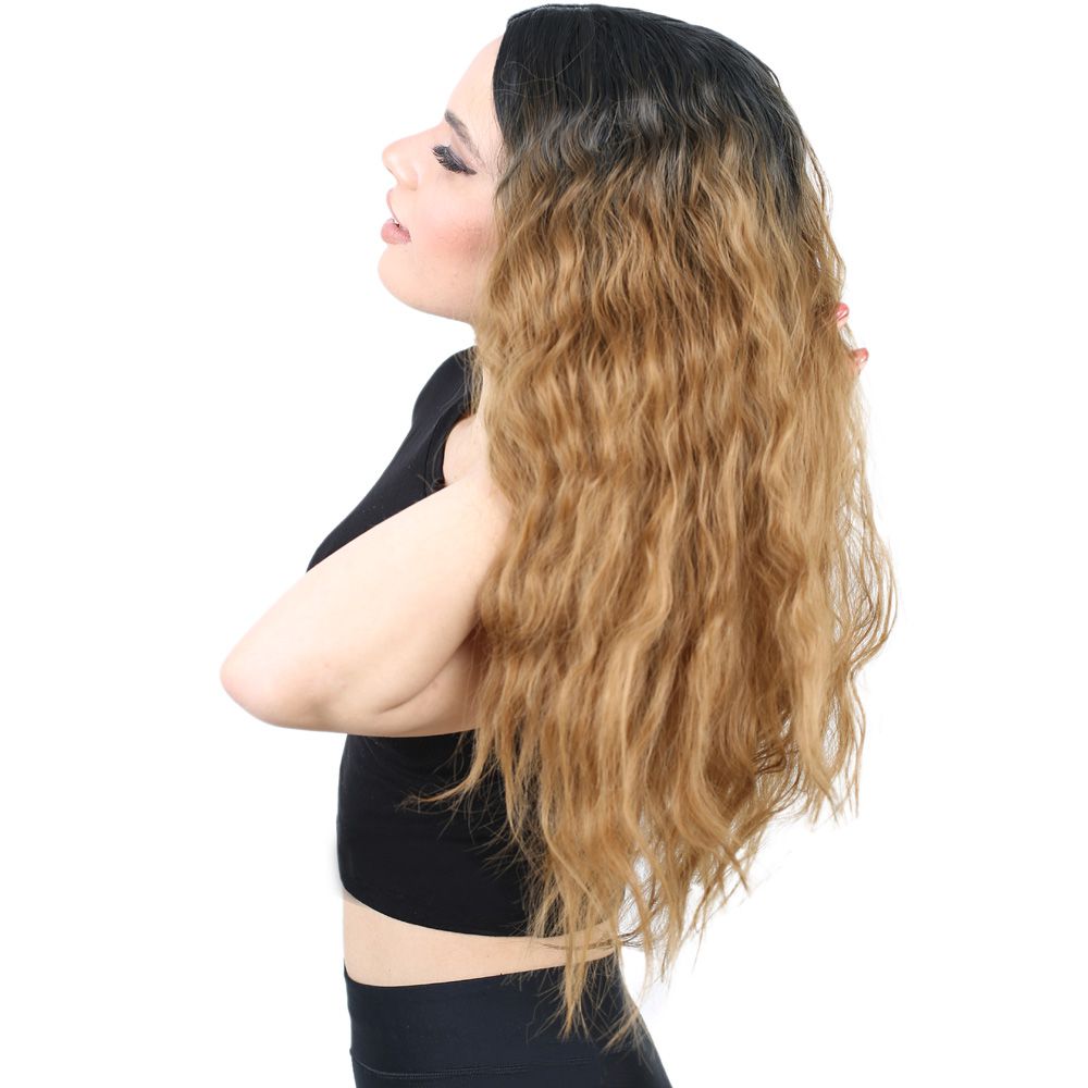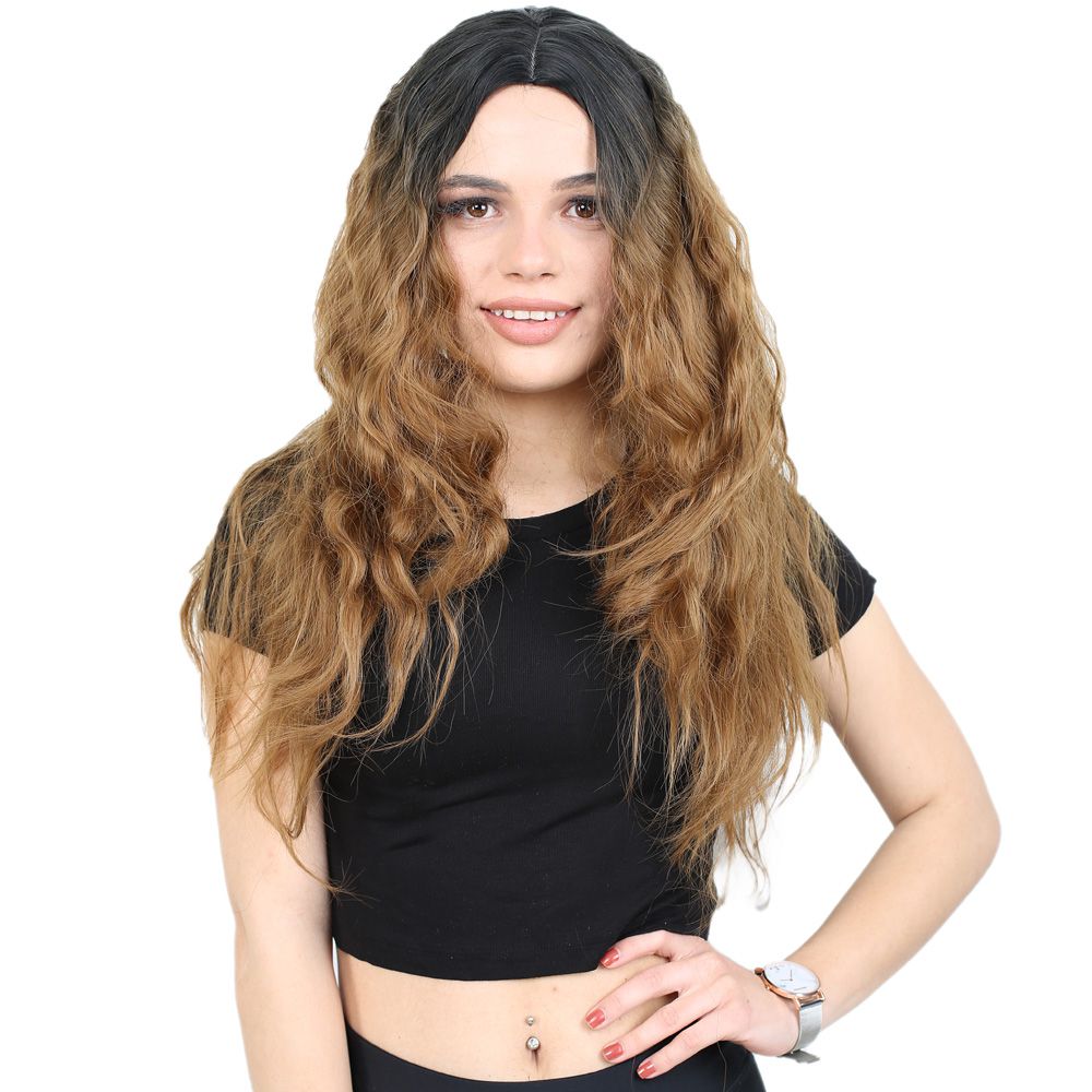 Kabarık Dalgalı Uzun Fiber Sentetik Peruk - Siyah / Karamel Ombreli