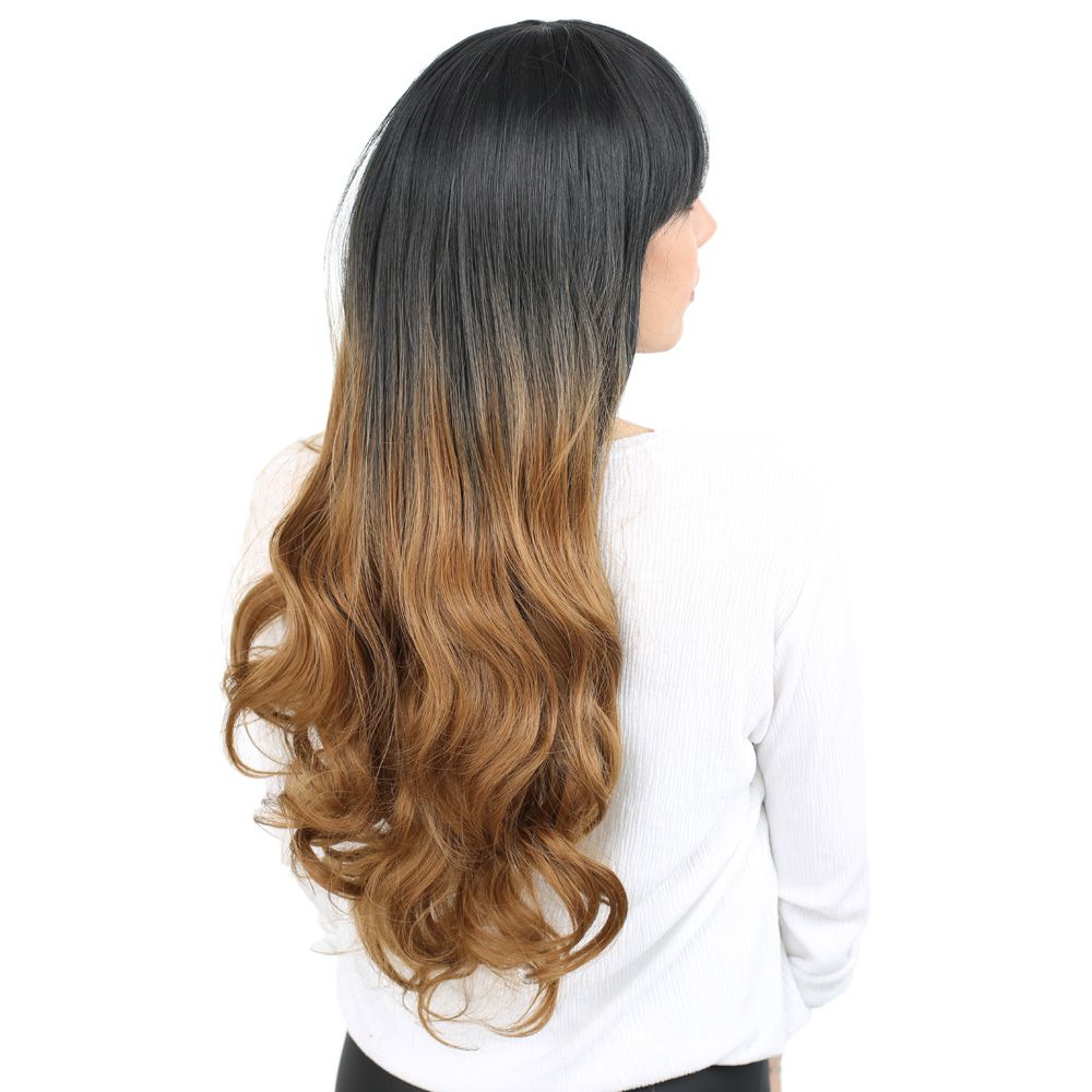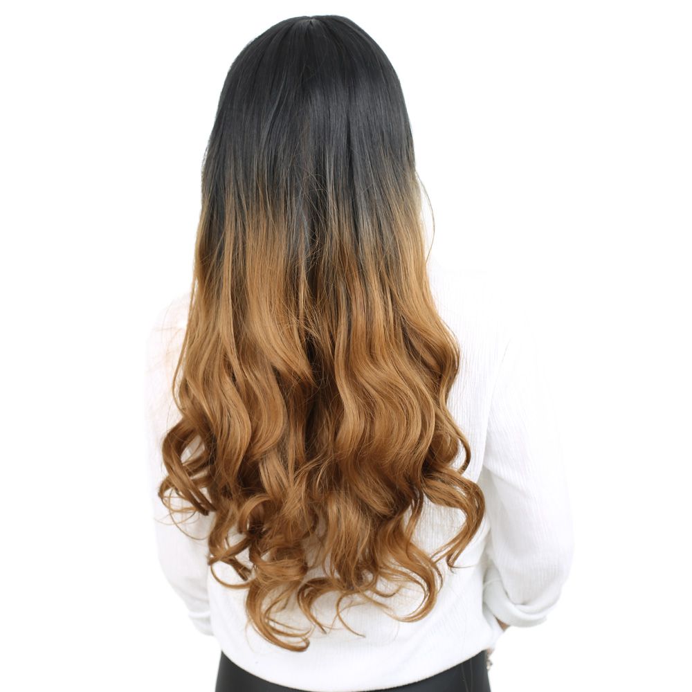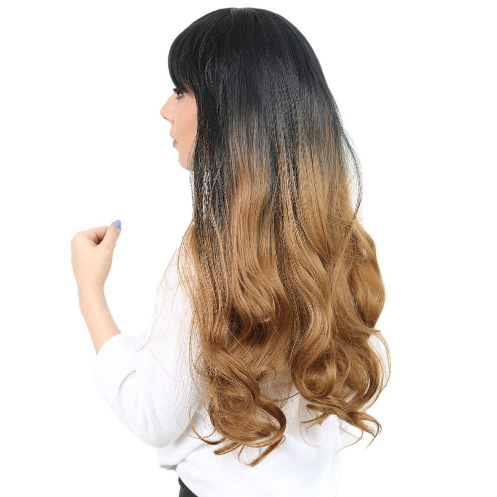 Kahküllü Uzun Dalgalı Fiber Sentetik Peruk - Siyah / Karamel Ombreli