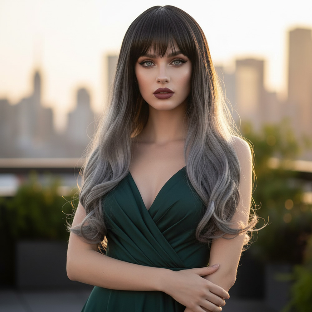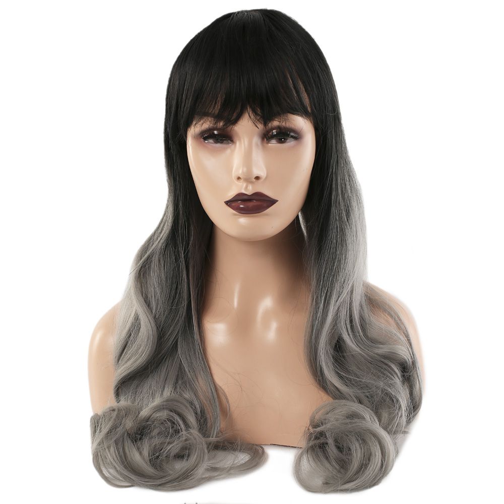 Kahküllü Uzun Dalgalı Fiber Sentetik Peruk - Siyah Gri Ombreli