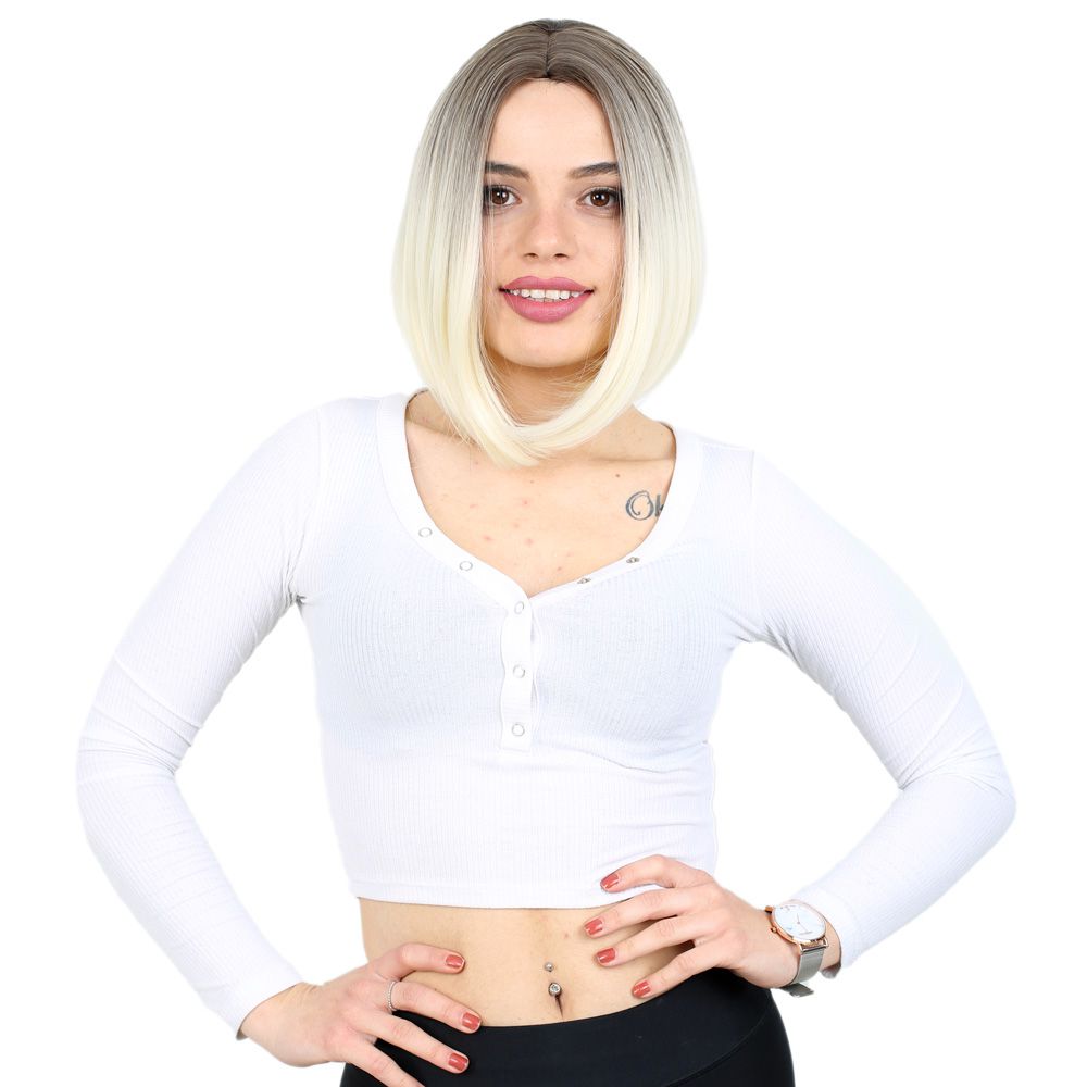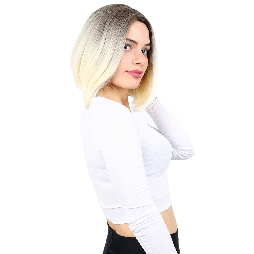Kahkülsüz Düz Kısa Fiber Sentetik Peruk - Küllü Açık Kahve / Platin Ombreli