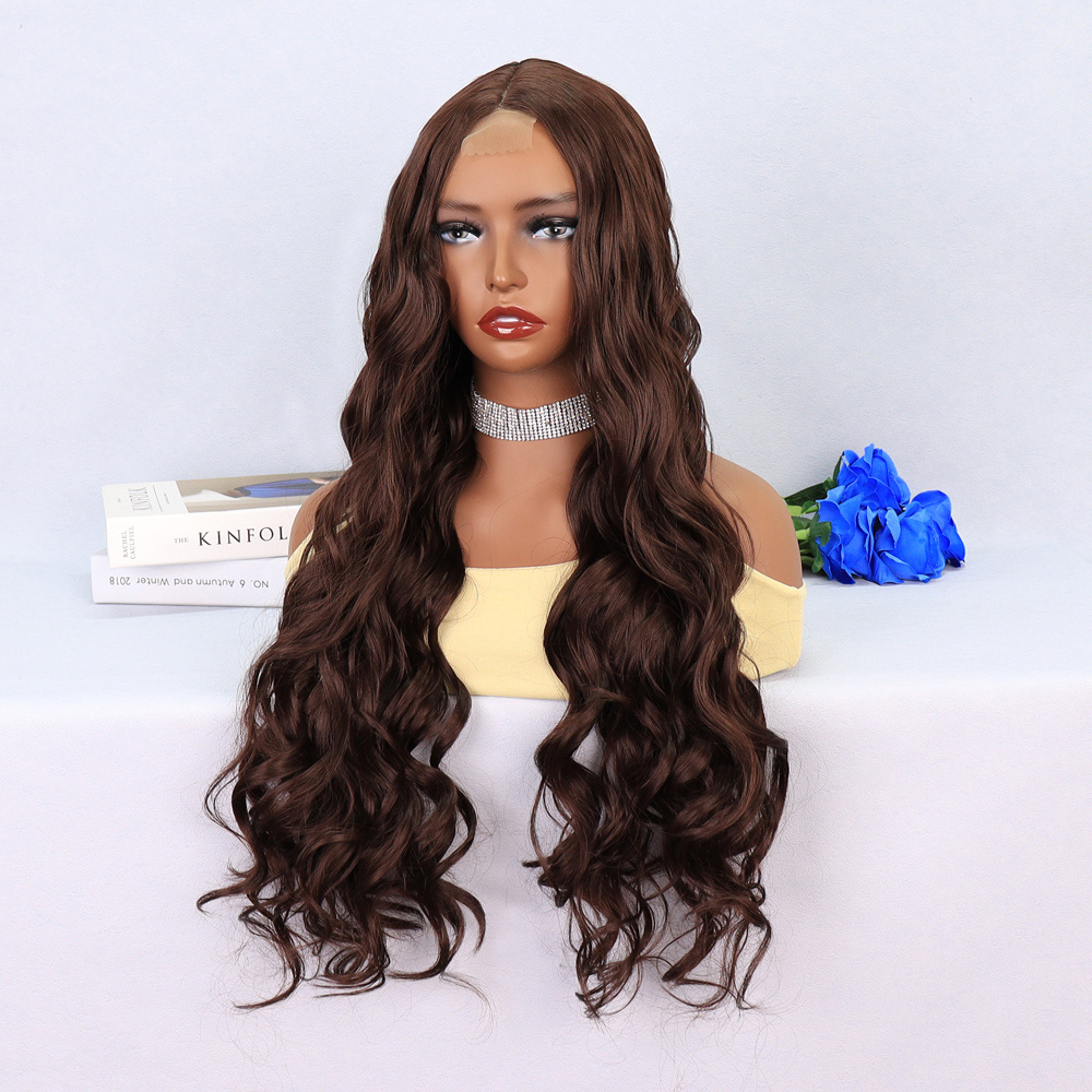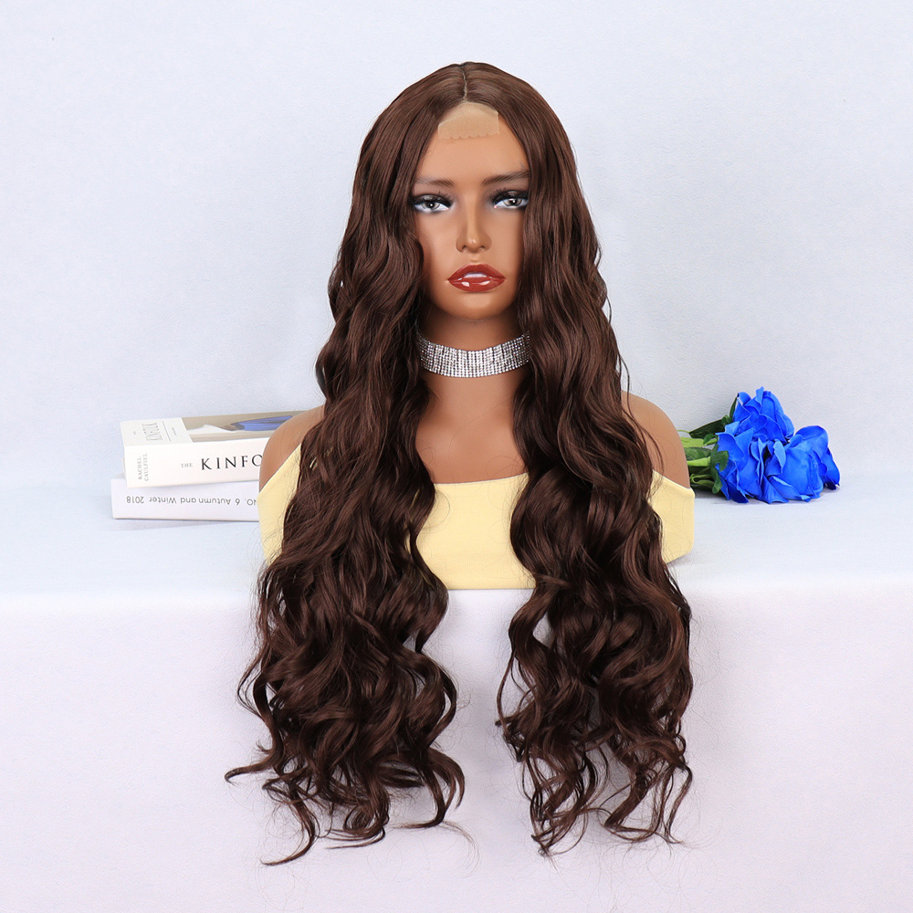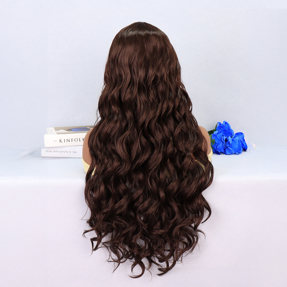 Koyu Kumral Ekstra Uzun Fiber Sentetik Dalgalı Tül Peruk