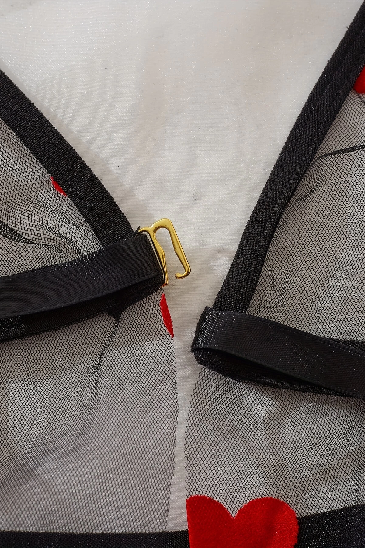 Büyük Kırmızı Kalp Desenli Siyah Saten Gecelik