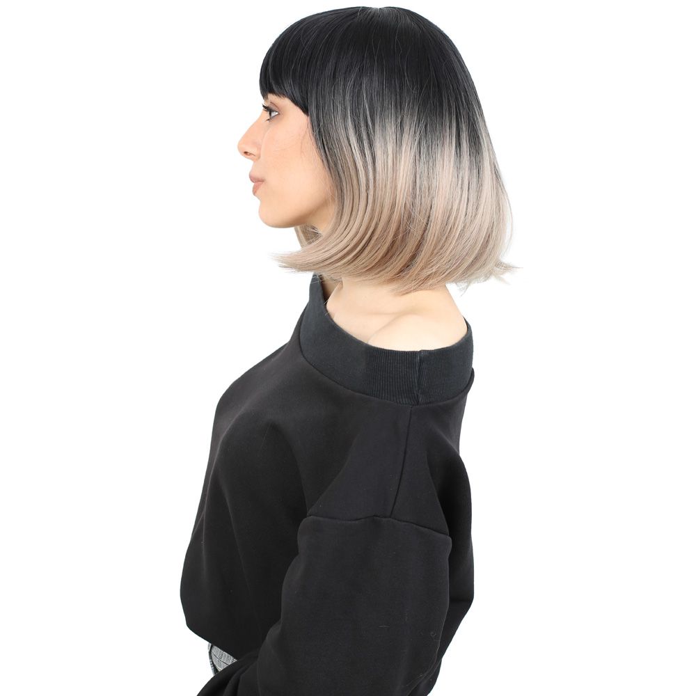 Kısa Küt Perçemli Fiber Sentetik Peruk - Siyah / Küllü Bebek Sarı Ombreli