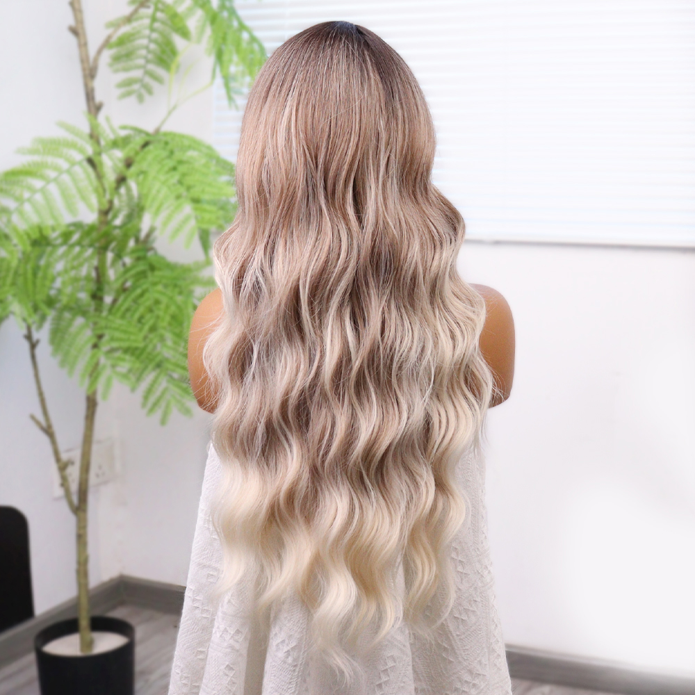 Uzun Su Dalgası Fiber Sentetik Peruk - Küllü Kumral / Beyaz Platin Ombre