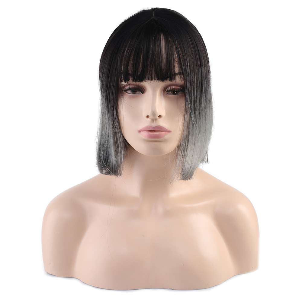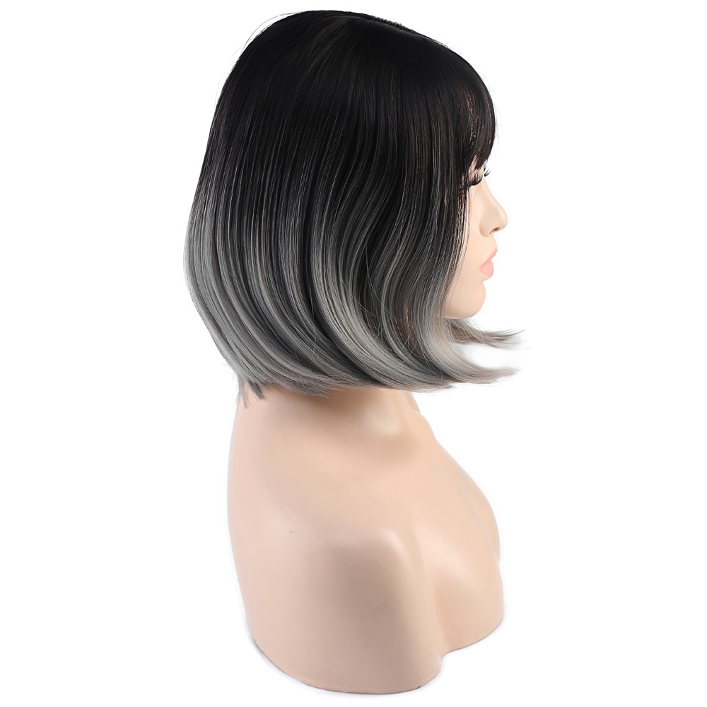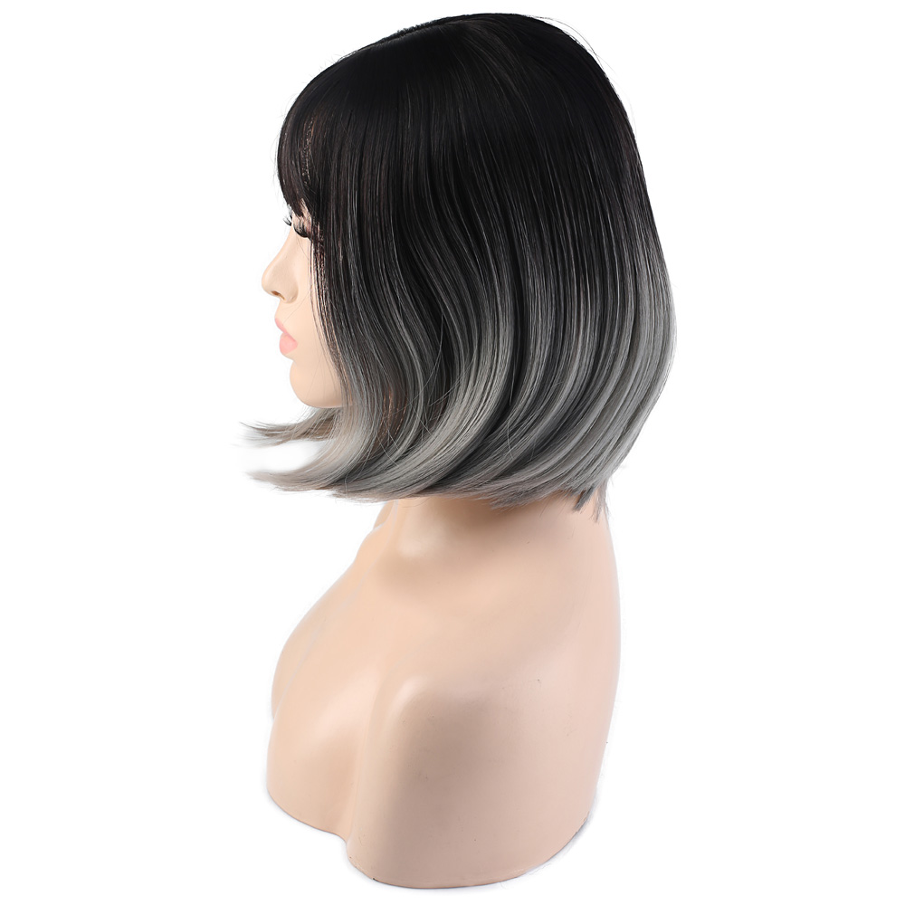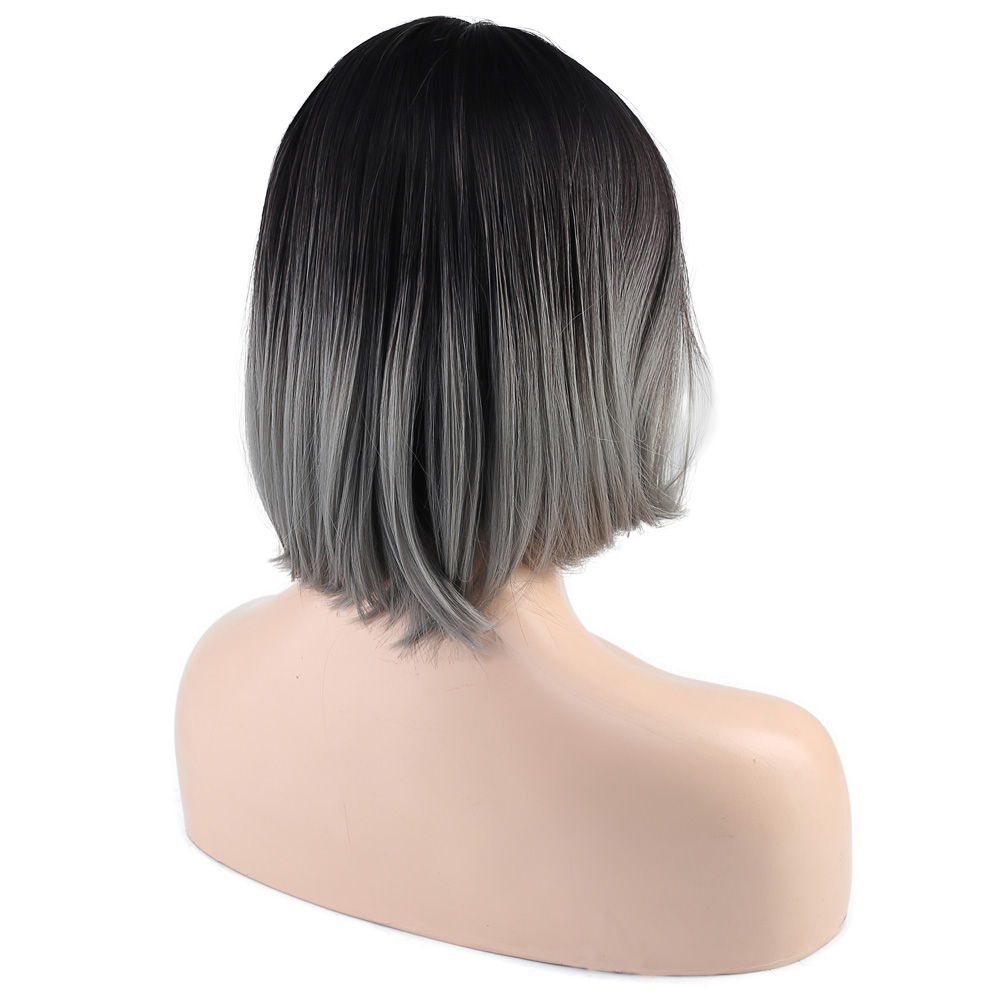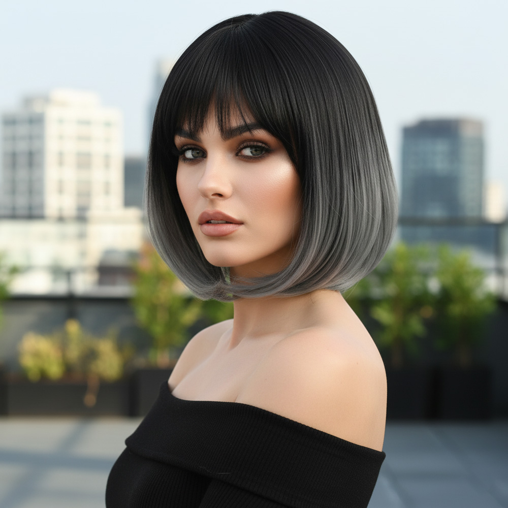 Küt Perçemli Fiber Sentetik Peruk - Siyah / Gri Ombreli