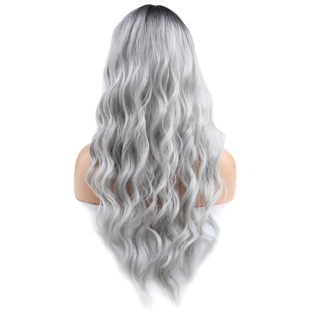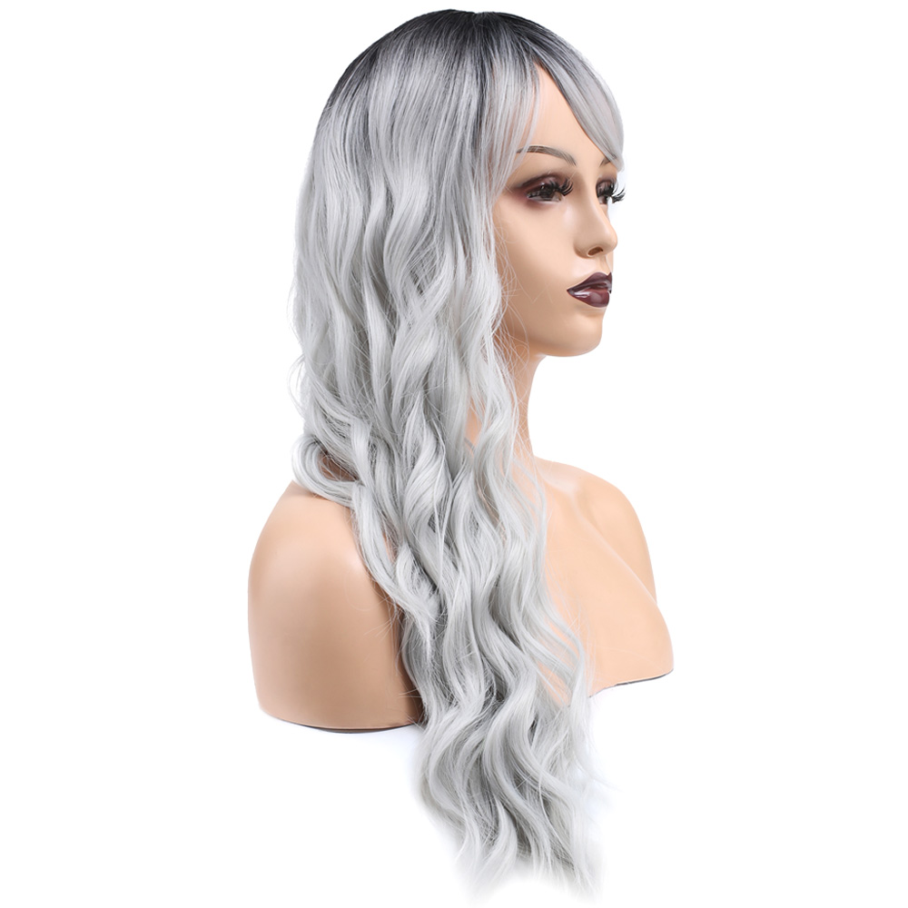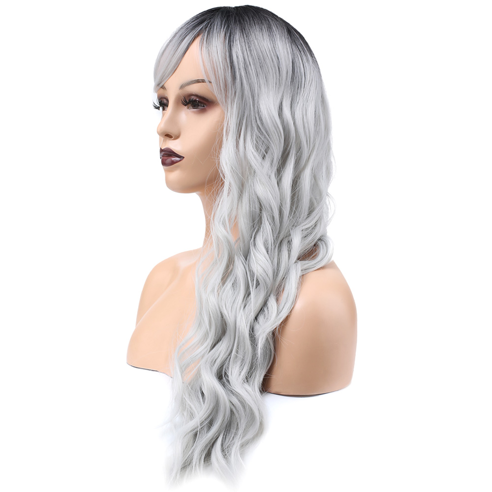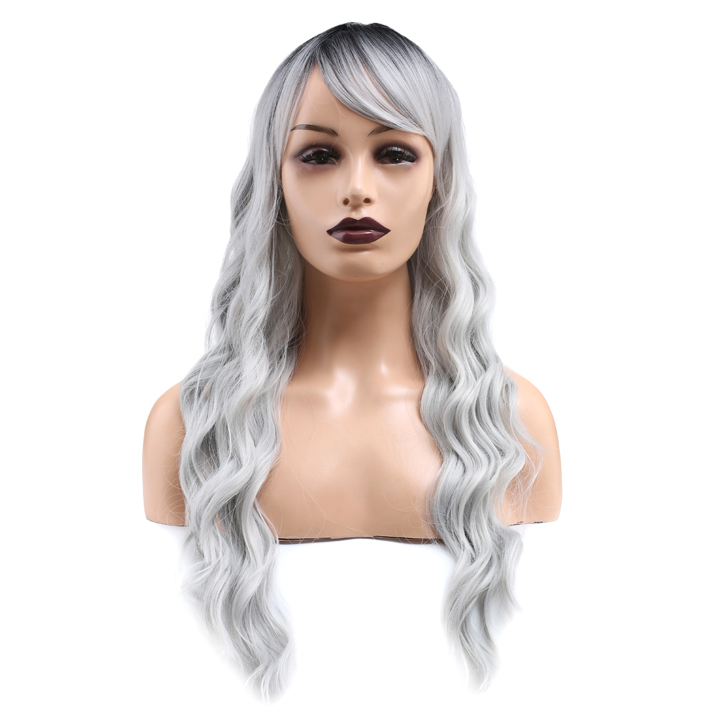 Perçemli Uzun Su Dalgası Fiber Sentetik Peruk - Siyah / Açık Gri Ombreli