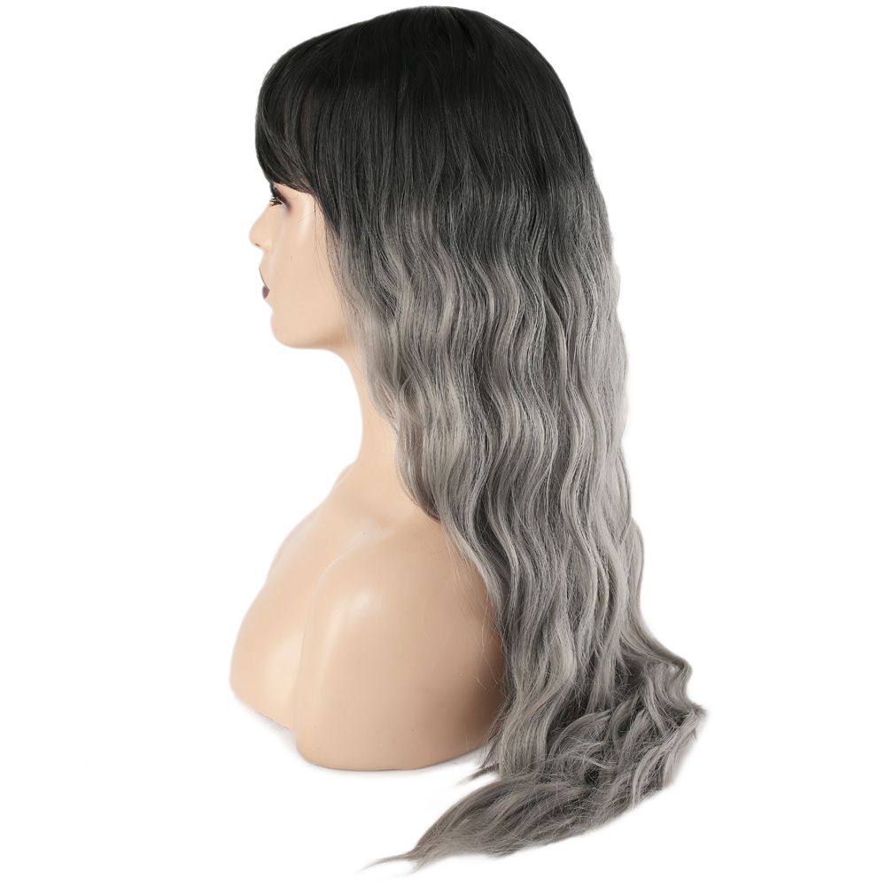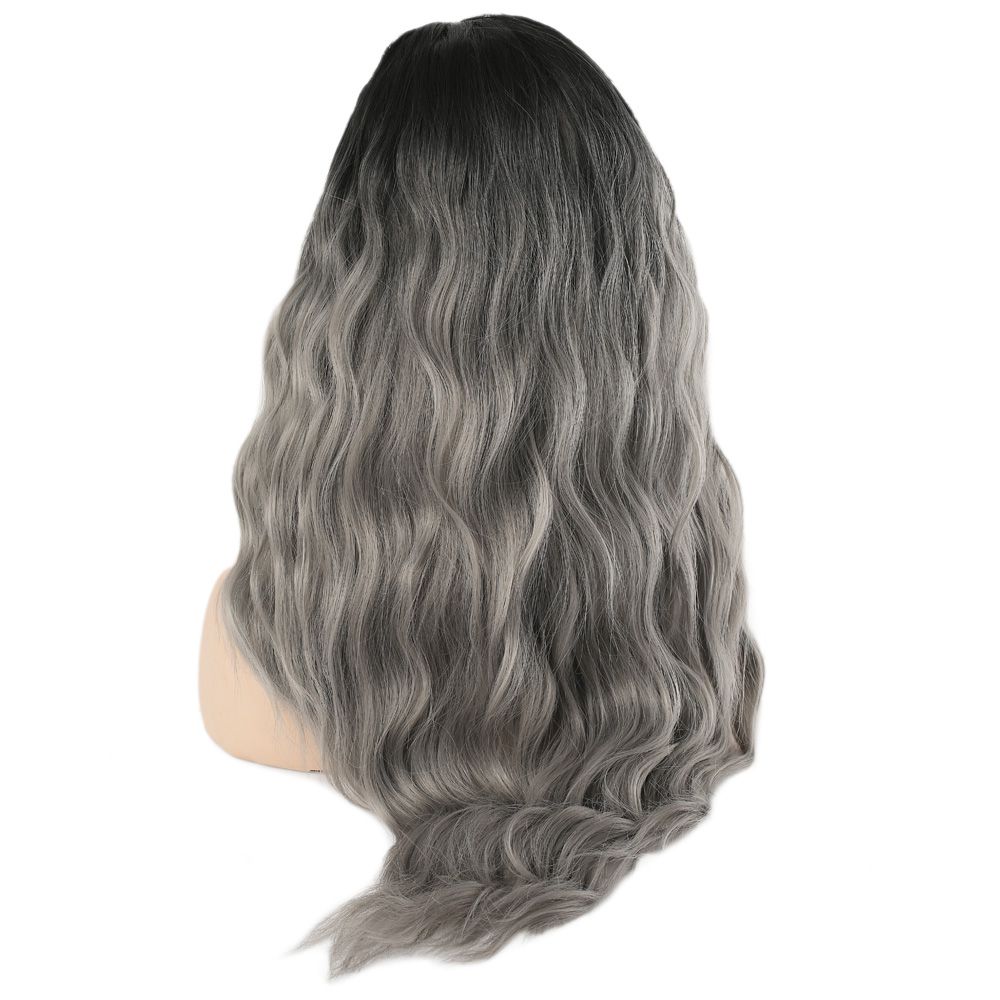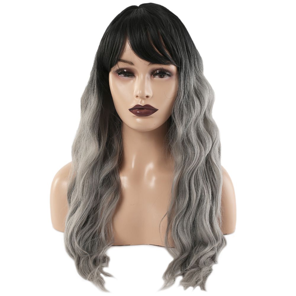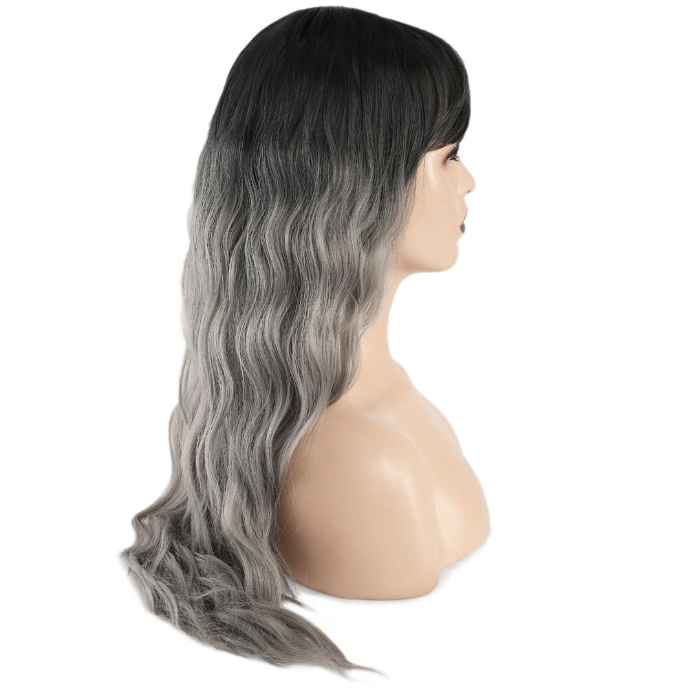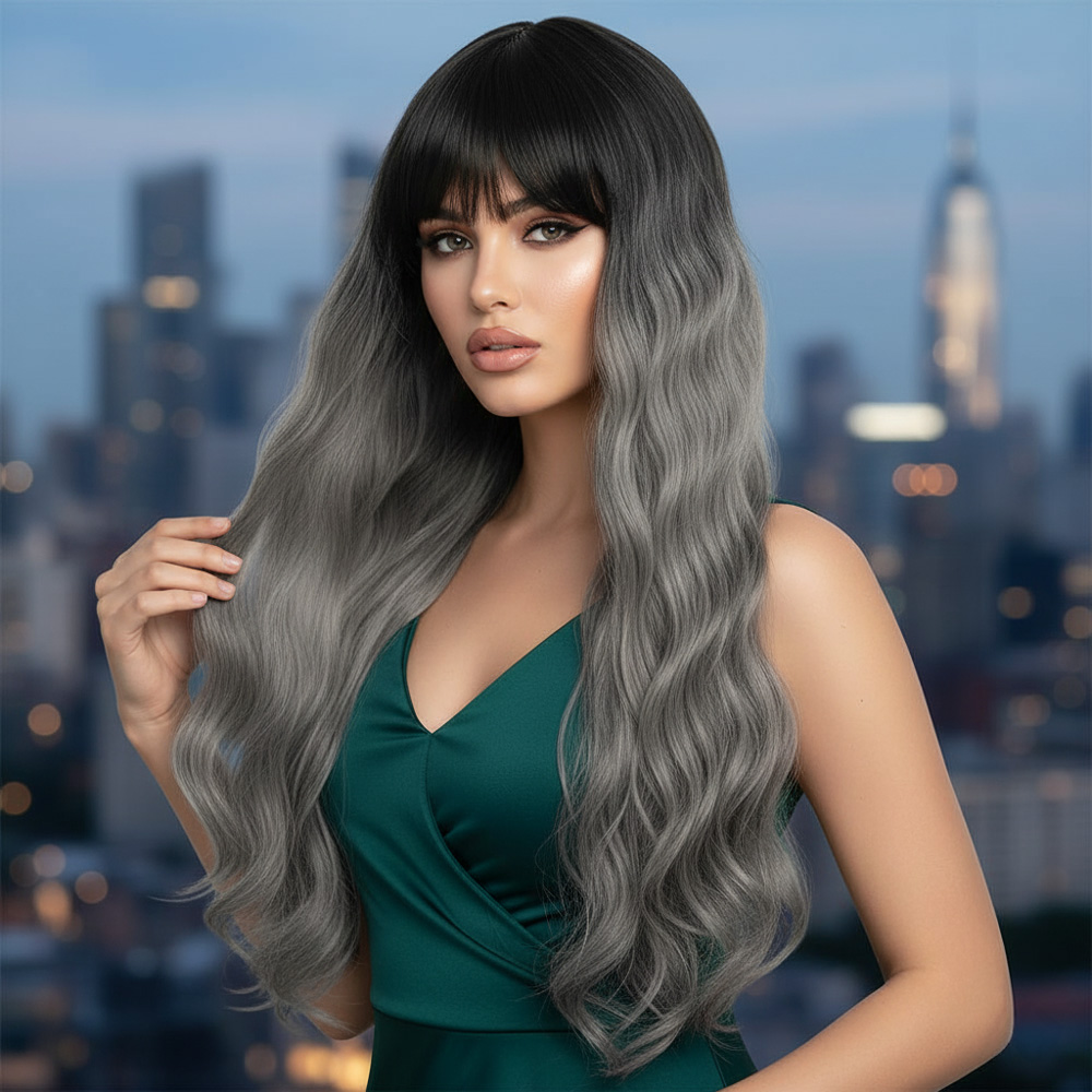 Perçemli Uzun Su Dalgası Fiber Sentetik Peruk - Siyah / Gri Ombreli