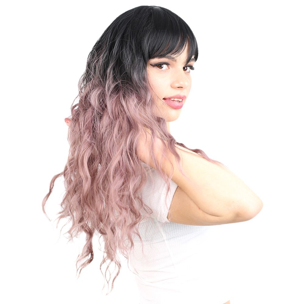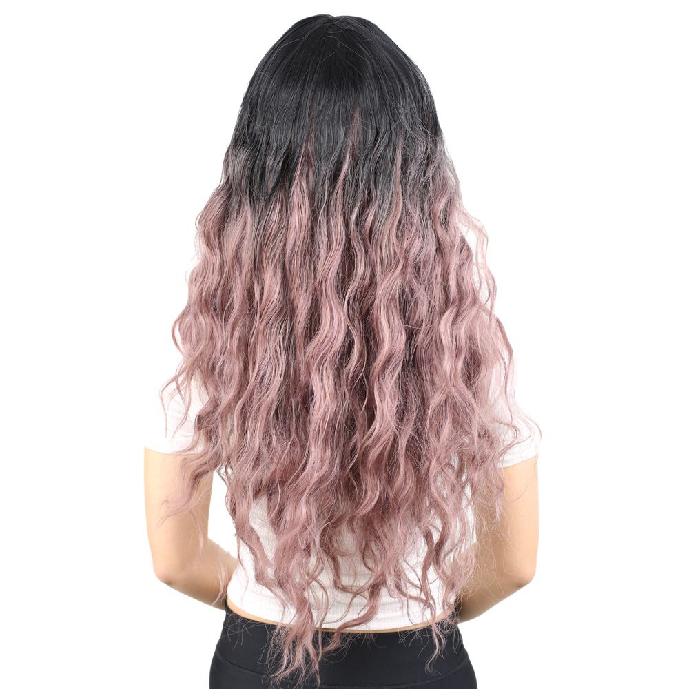 Perçemli Uzun Su Dalgası Fiber Sentetik Peruk- Siyah / Gül Kurusu Ombreli