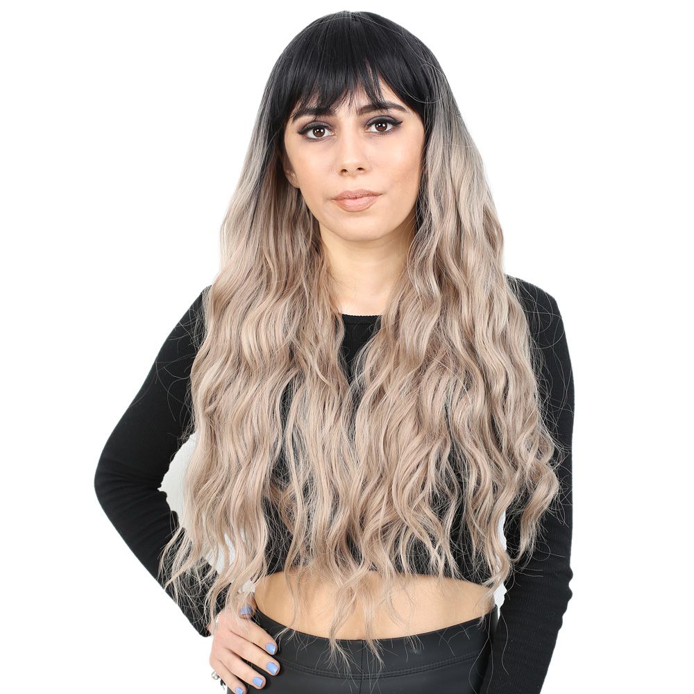 Perçemli Uzun Su Dalgası Fiber Sentetik Peruk- Siyah / Küllü Bebek Sarı Ombreli