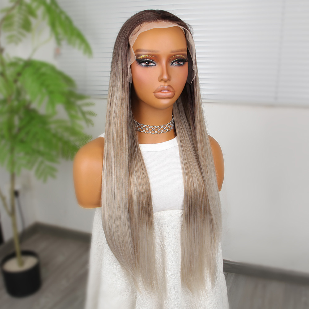 Uzun Su Dalgası Fiber Sentetik Peruk - Küllü Kumral / Beyaz Platin Ombre