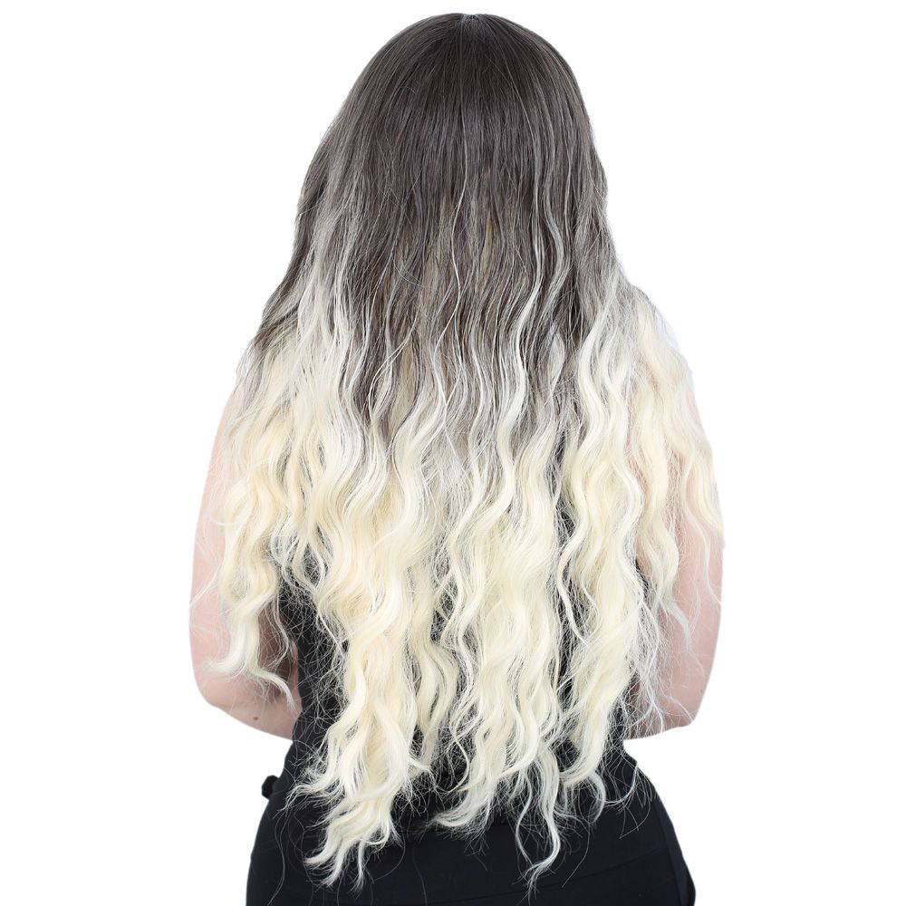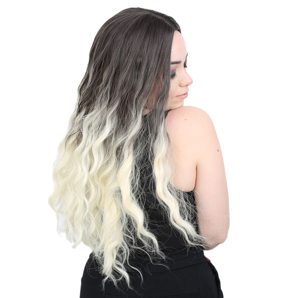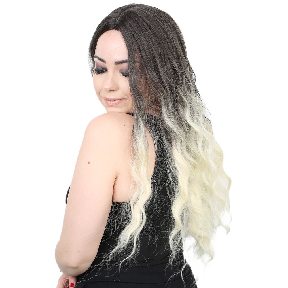 Su Dalgası Uzun Perçemsiz Fiber Sentetik Peruk - Küllü Siyah / Platin Ombreli