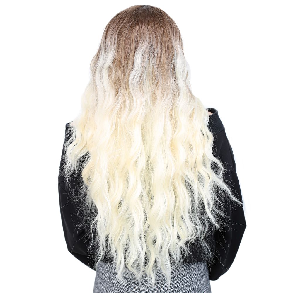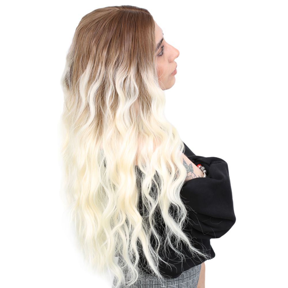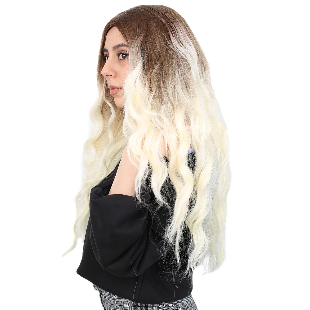Su Dalgası Uzun Perçemsiz Fiber Sentetik Peruk - Kumral / Platin Ombreli