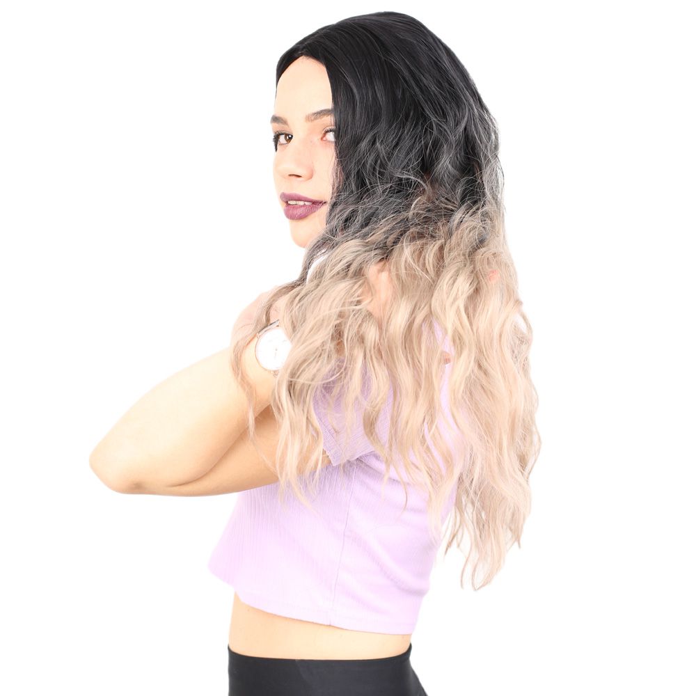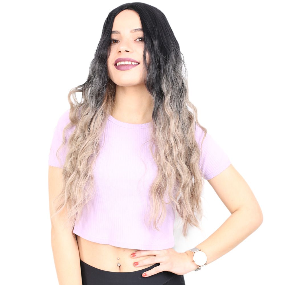 Su Dalgası Uzun Perçemsiz Fiber Sentetik Peruk - Siyah / Küllü Bebek Sarı Ombreli