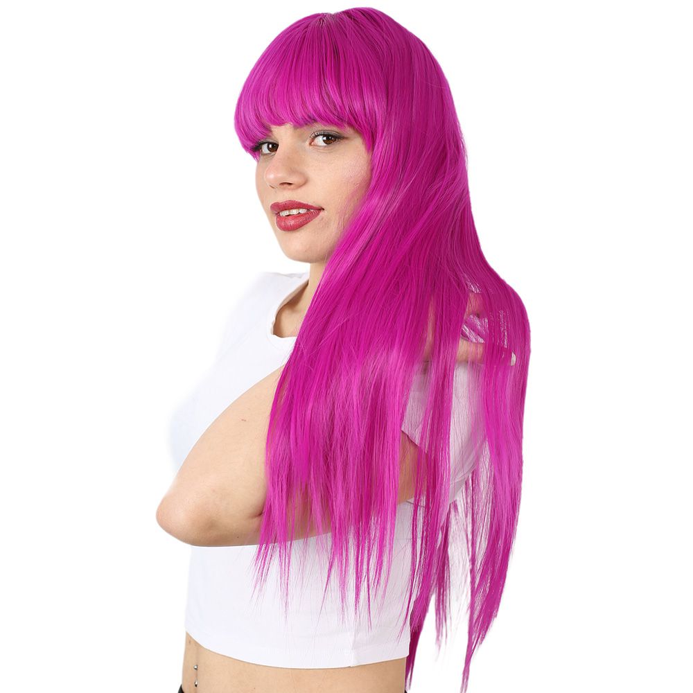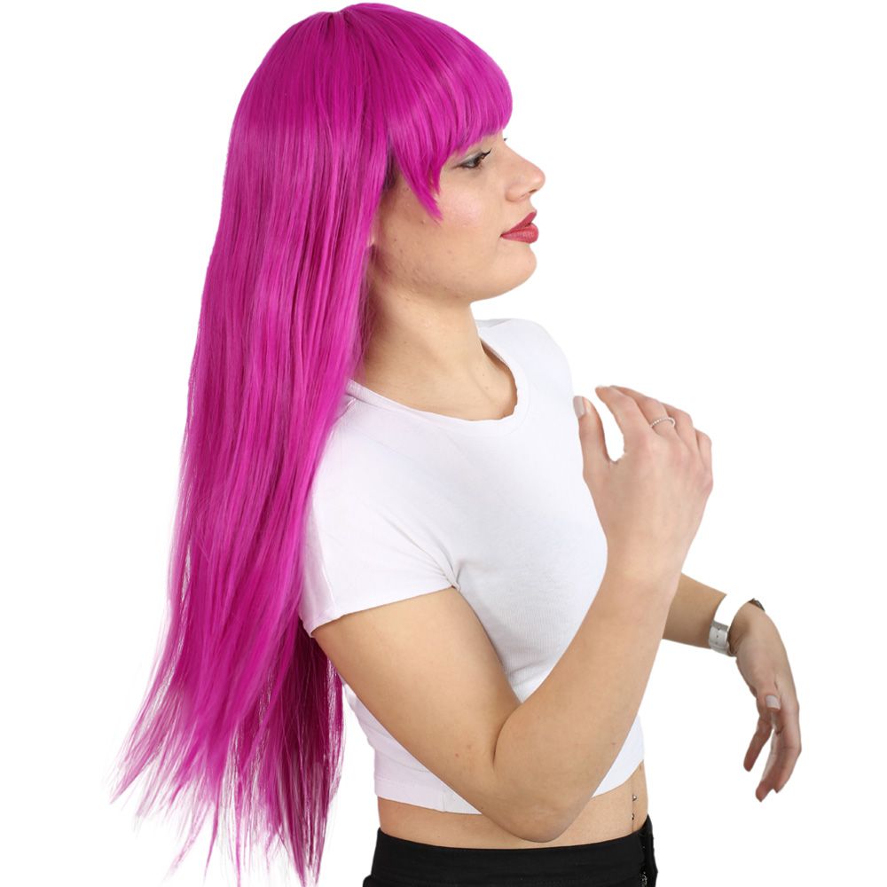 Uzun Kahküllü Fiber Sentetik Peruk - Fuşya