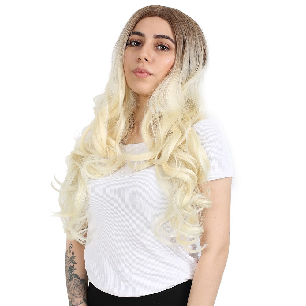 Yoğun Dalgalı Fiber Sentetik Uzun Perçemsiz Peruk - Kumral / Platin Ombreli